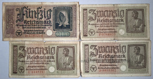 3 x 20, 1х 50 reihsmarkas, ko izdeva Reihskreditkassenschein (Reiha kredītbankas) izmantošanai okupētajās teritorijās Otrā pasaules kara laikā (1940–1945).