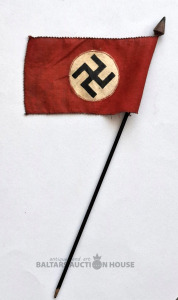 Trešā reiha patriotiskais karogs. Vācijas divpusējs valsts karogs Trešā reiha laikā, 1933.–1945. gads. Karogs karājas uz koka stieņa, kura izmēri ir 13,5 x 8 cm. Stieņa garums ir 31 cm.