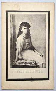 Antīka sēru kartīte. 22 cm x 13,5 cm. Attēlā attēlota lielkņaziene Anastasija Nikolajevna, pēdējā Krievijas imperatora Nikolaja II jaunākā meita. Viņa piedzima 1901. gada 18. jūnijā un kopā ar ģimeni tika nogalināta Jekaterinburgā 1918. gada 17. jūlijā. Anastasija bija pazīstama ar savu dzīvespriecīgo personību un blēņām bērnībā. Pēc revolūcijas un viņas ģimenes nāves gadu desmitiem klīda baumas, ka Anastasija, iespējams, izdzīvoja, radot iemeslu daudziem krāpniekiem.