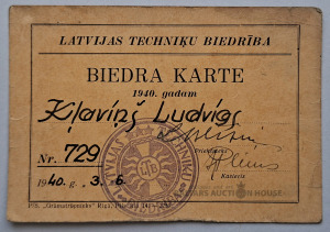 Latvijas Tehniķu biedrības biedra karte, izdota 1940. gadā. Organizācija: Latvijas Tehniķu biedrība (Latvijas Tehniķu biedrība). Dokumenta veids: Biedra karte (Biedra karte) 1940.gadam.