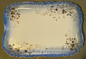 Paplāte/liels servējamais šķīvis, porcelāns, zeltījums, roku gleznojums, 32x22,2 cm, neliels zilās krāsas nodilums, Kuzņecova f-ka Duļevā, ap 1900.g.