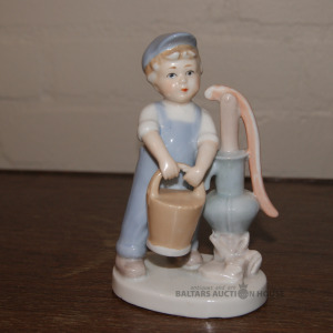 skaistu un detalizētu porcelāna figūriņu, kurā attēlots zēns pie ūdens sūkņa ar spaini rokās. Maigas pasteļkrāsas, kvalitatīvs izpildījums.