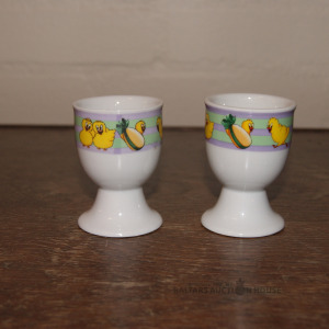 divus skaistus un kvalitatīvus porcelāna olu turētājus. Dekorēti ar košiem cālīšu zīmējumiem