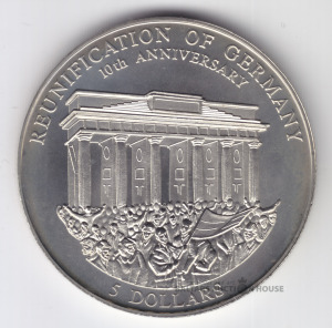 Piemiņas monēta, Libērija, 5 Dolāri 2000.g., "10 Vācijas vienotības gadi" , monēta kapsulā, Metāls: CuNiZn, Reljefa kvalitāte: BU, Diametrs: 40 mm, Svars: 32g Tirāža: maks. 20 000 eksemplāru