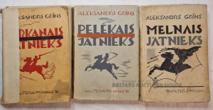 3 grāmatas. 1) Sarkanais jātnieks; 2) Pelēkais jāttnieks; 3) Melnais jātnieks. Aleksandrs Grīns. Vāki: Nīklavs Struņķis/Strunke. Rīga, Valtters un Rapa, 1938., 1940. gads